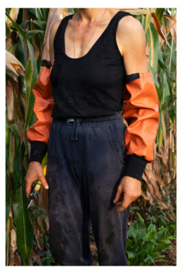 It is also a time made up of repetitive actions, gestures as a performance of the body in space, a dance through vegetables, soil, water, sky. The biological life cycles unfolding in the field encounter the presence of a female body that interacts with them, nourishes and is nourished.